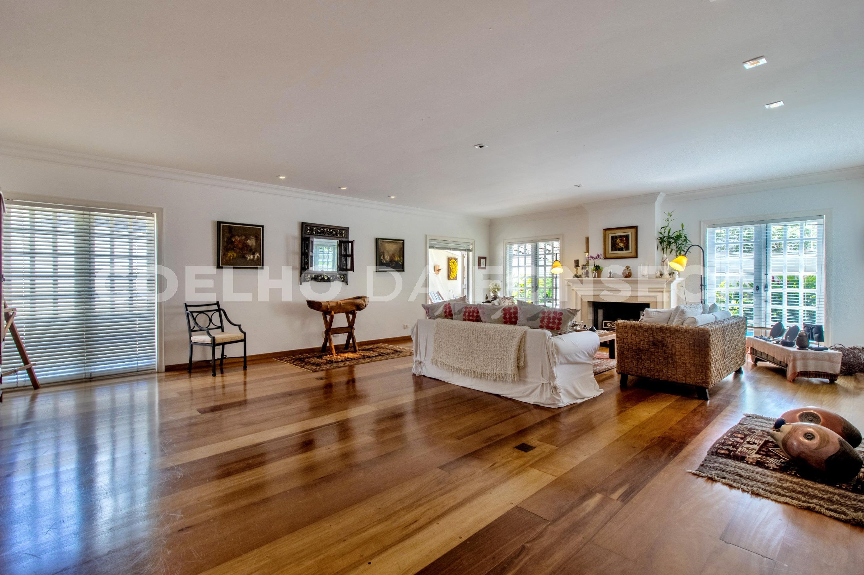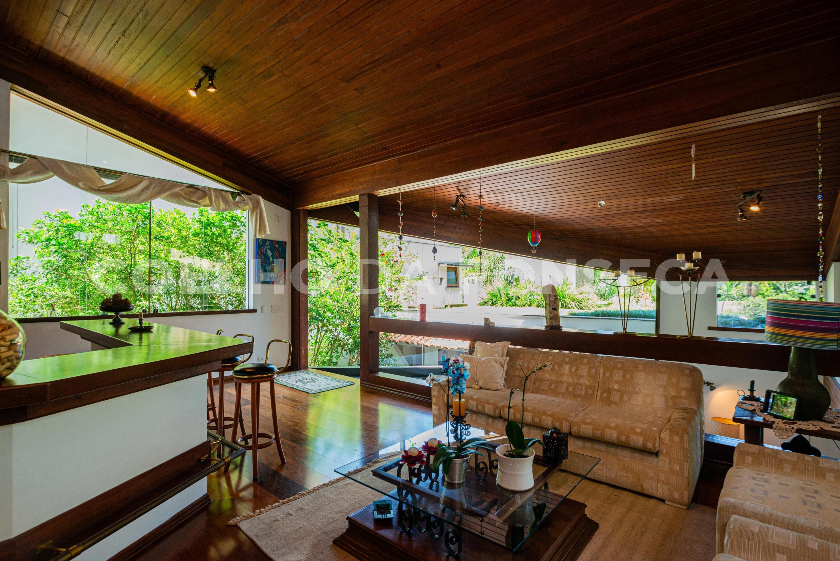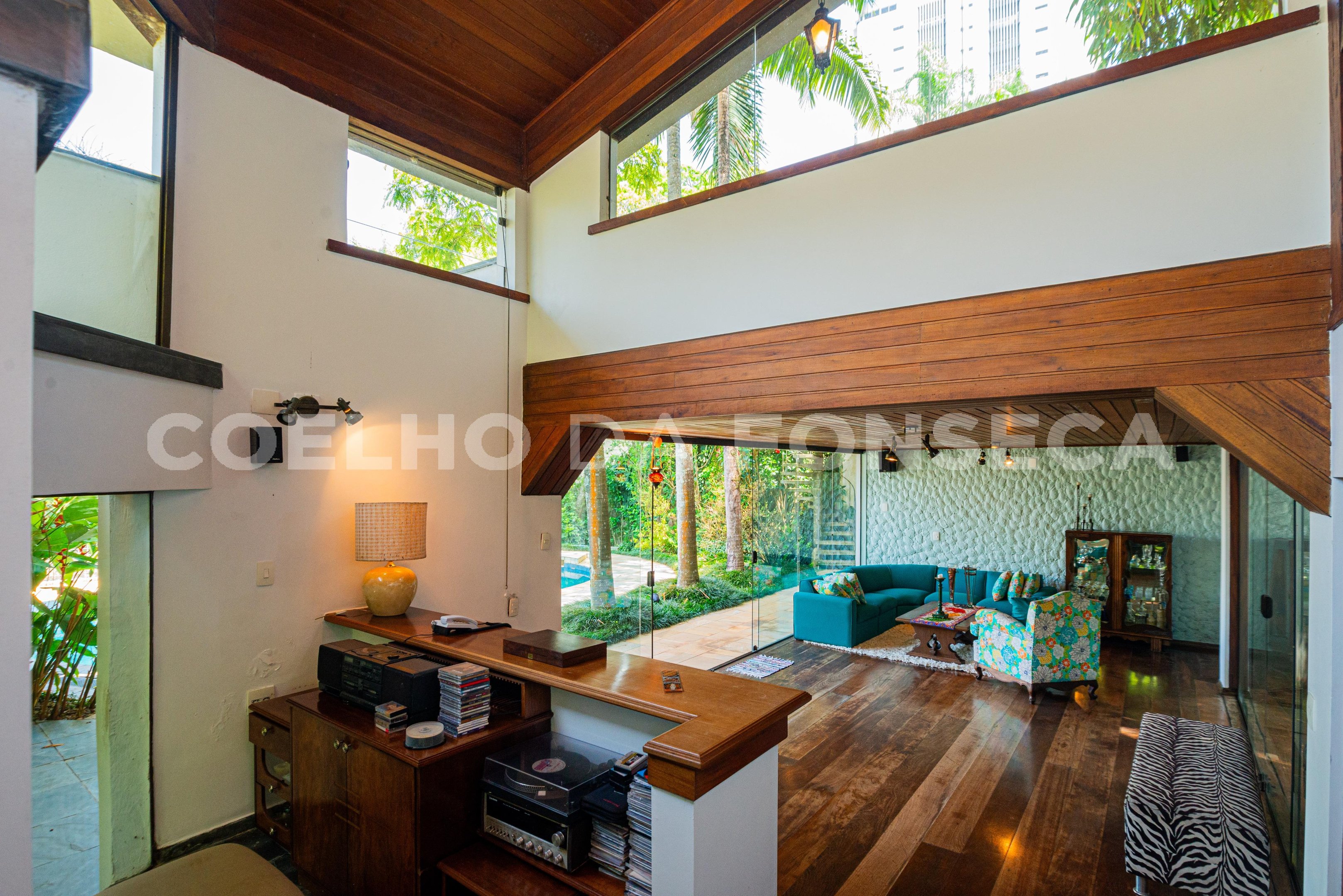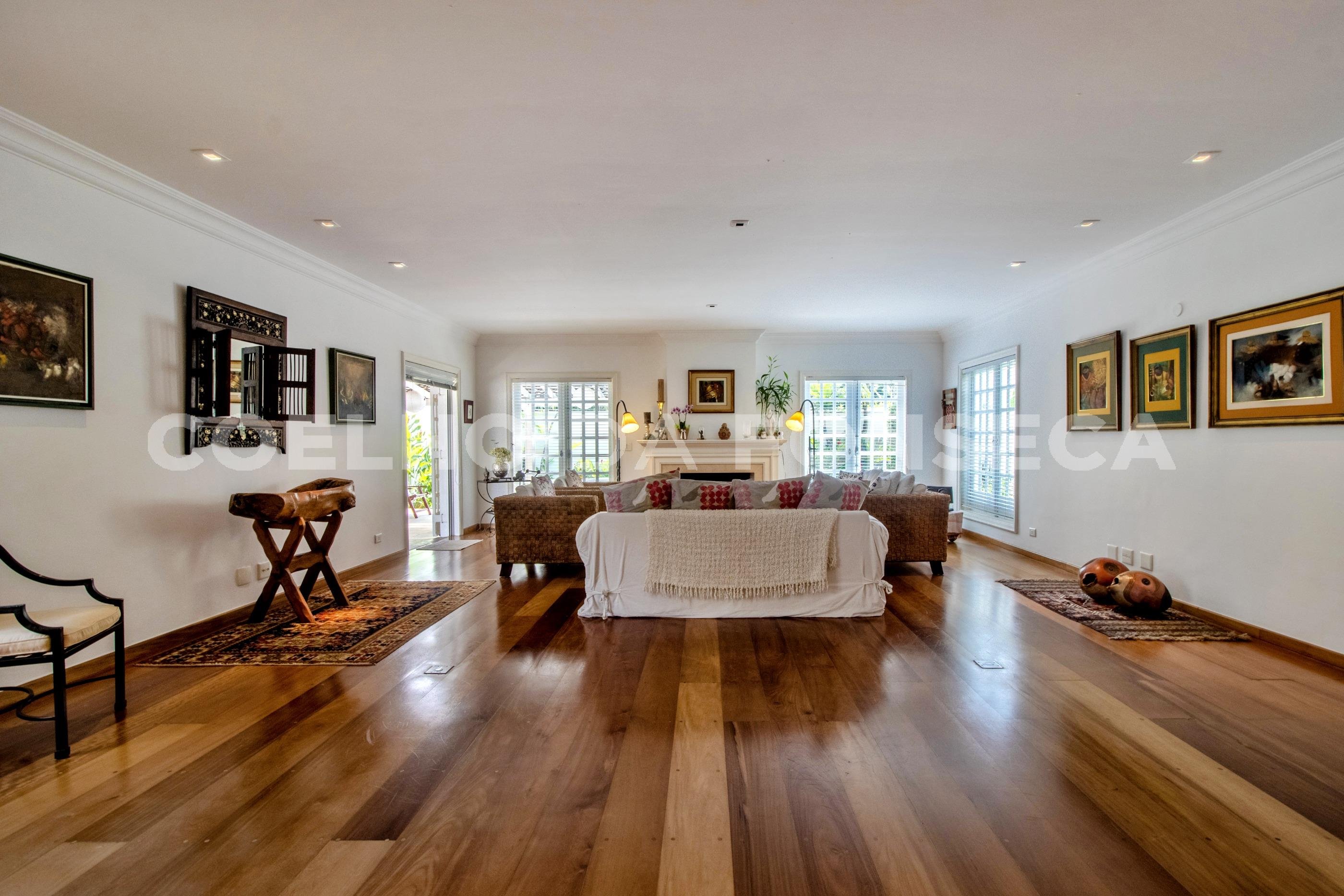 Linda casa reformada totalmente integrada mas com lindas portas de correr em todos os ambientes que podem proporcionar privacidade se necessário. Piso de madeira no living e na área dos dormitórios, Ar-condicionado em todos ambientes, projeto de iluminação e de som. Área gourmet com churrasqueira e forno de pizza e piscina embaixo de deck móvel por controle remoto. A área de serviço e dois quartos grandes e sala de funcionários fica no andar da garagem e o elevador acessa todos os níveis.
