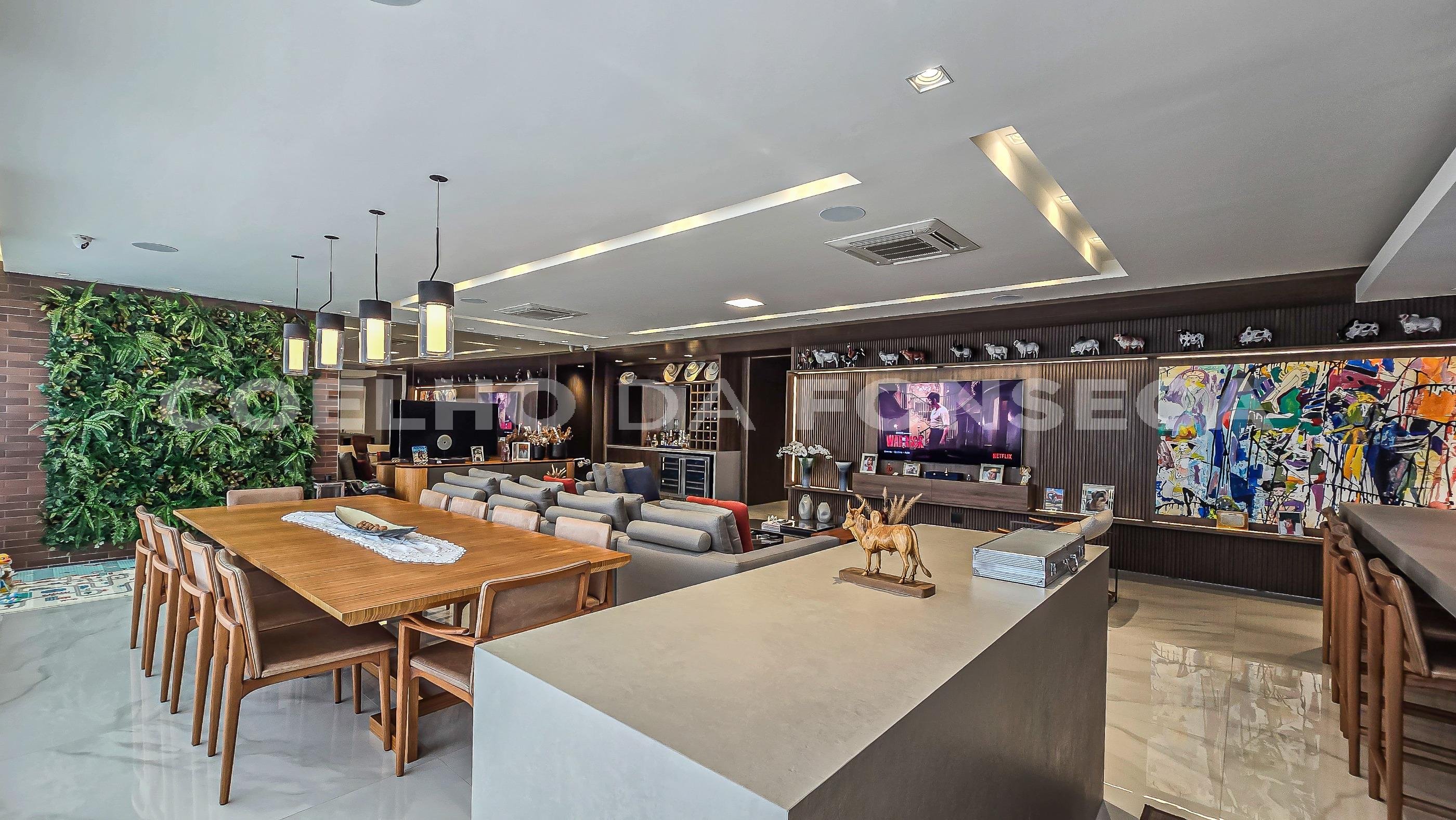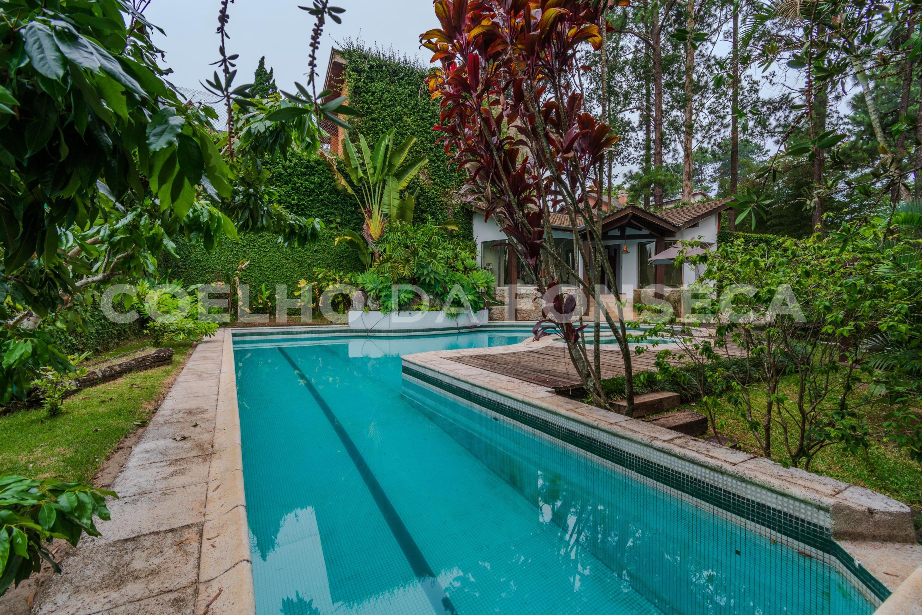 "Excelente casa de esquina, estilo chácara, construída em 2 lotes, com 713 m². Destaca-se um terreno de 417m² que faz parte do lazer da casa, com um amplo quintal verde, espaçoso e com lazer completo. Possui espaço gourmet equipado com churrasqueira, piscina e jacuzzi. São 4 suítes, todas com armários e banheiros atualizados. Sala com amplo living para 3 ambientes, integrado ao espaço gourmet, além de home theater. O piso é em mármore e madeira. A cozinha está equipada com armários planejados, com acesso à despensa, área de serviço e dependência para colaboradores. Possui 6 vagas de garagem. Próximo a: Bares, Restaurantes, Escolas, Faculdades, Farmácias, Shopping Centers, Supermercados, Postos de Combustíveis e Conveniências. Quanto à segurança, o condomínio oferece portaria blindada, portaria presencial, monitoramento 24 horas e ronda interna e externa. Agende sua visita com nossos especialistas e conheça este imóvel."
